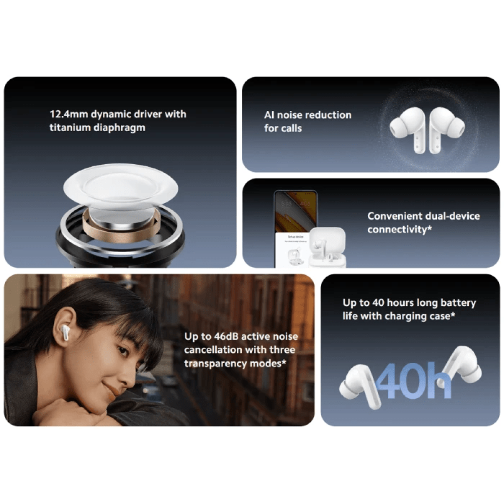 • إلغاء الضوضاء النشط بما يصل إلى 46 ديسيبل مع ثلاثة أوضاع للشفافية